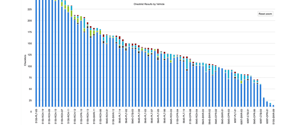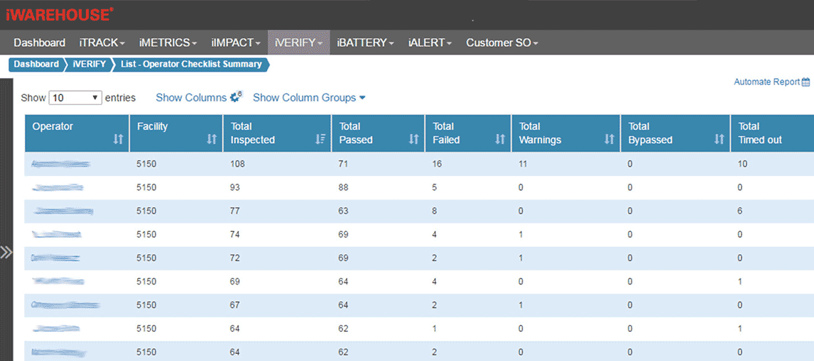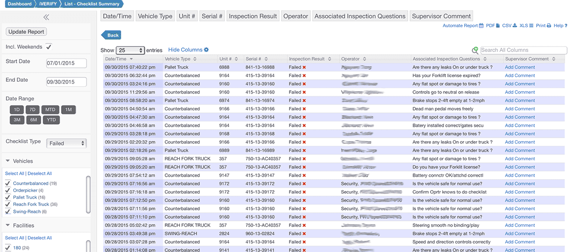 From the iWAREHOUSE Gateway, you can see critical information at quick-glance, including operator daily checklist completions and failures - and then drill down to see details including what questions and responses resulted in a failed checklist.