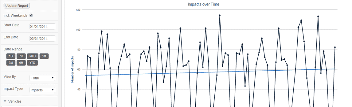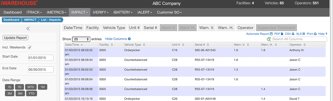Impact reports allow you to easily find vehicles or operators of concern, and address issues requiring attention. Determine whether further training is required or if a change in the warehouse environment must be made.